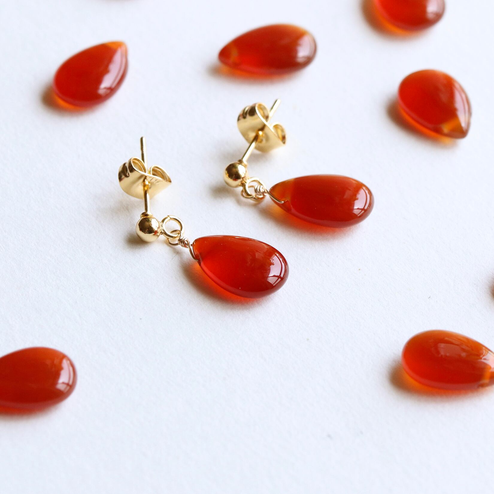落ち着いた雰囲気の中に、光を受けると鮮やかな赤やオレンジにきらめき、耳元を印象的に彩ります。