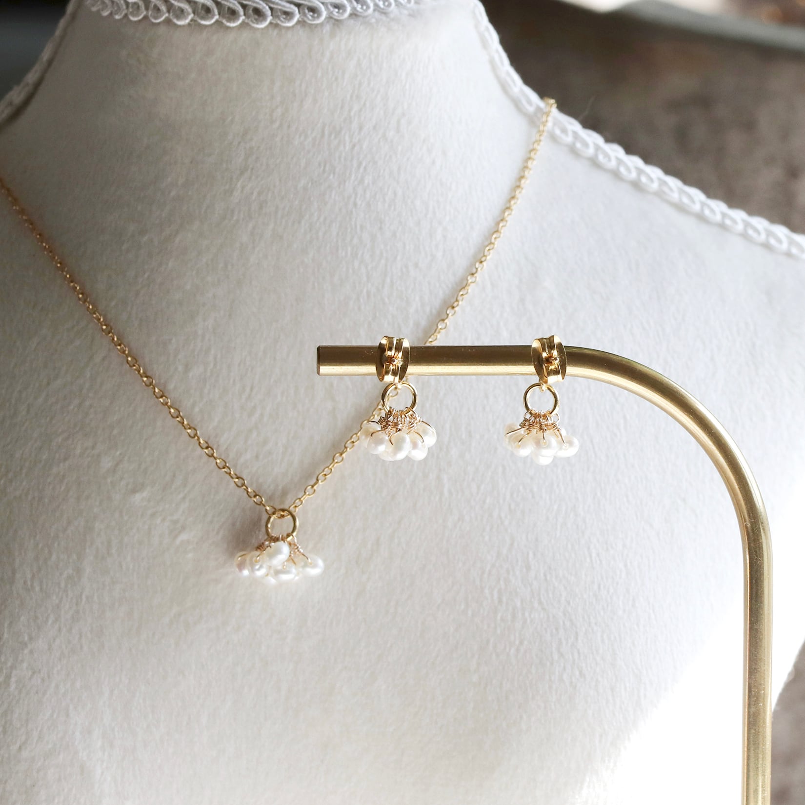 小粒の淡水パールをぎゅっと並べた、上品で愛らしいデザイン。