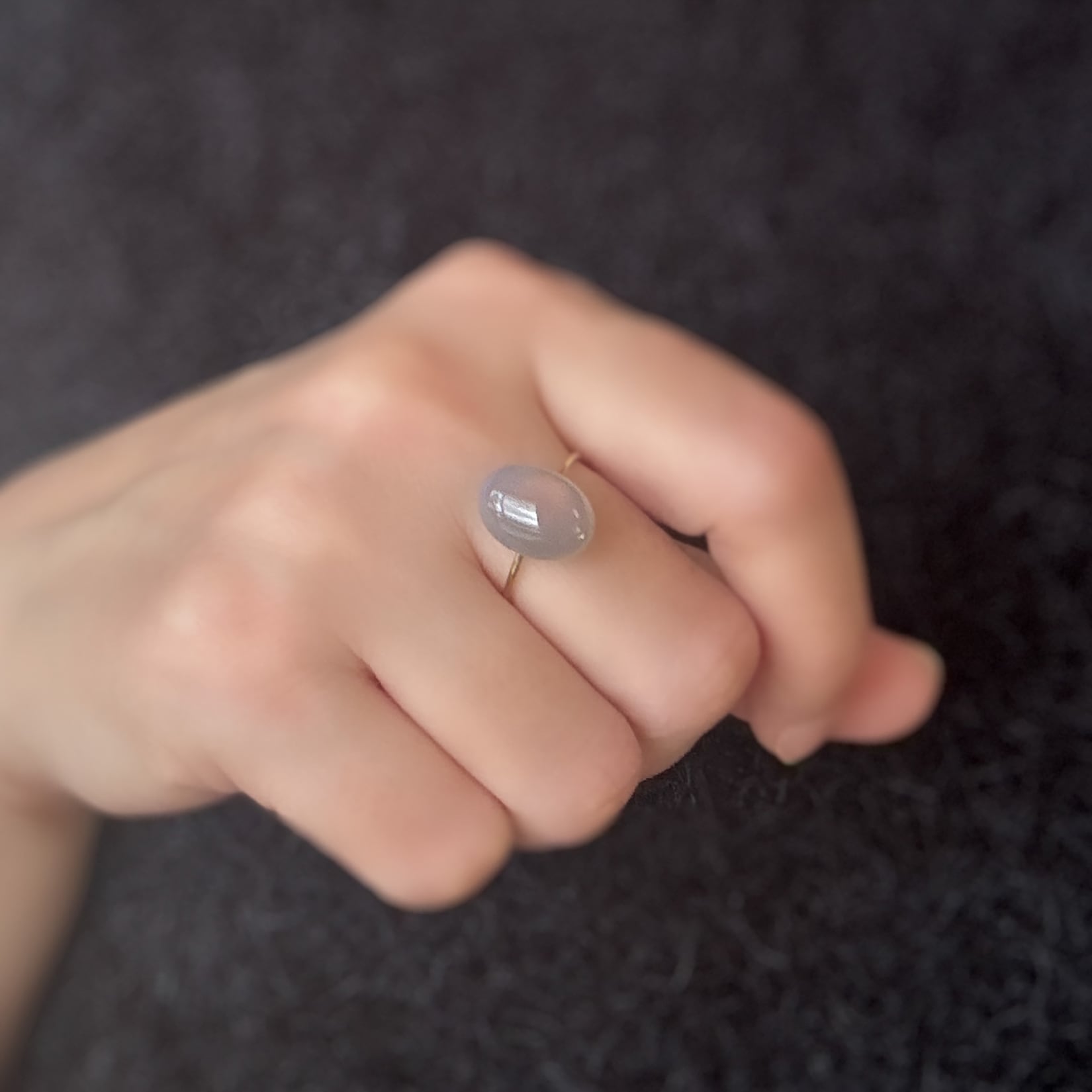 ほんのり透け感を帯びたアイスグレーの石が、指先にさりげないモード感を添えます。