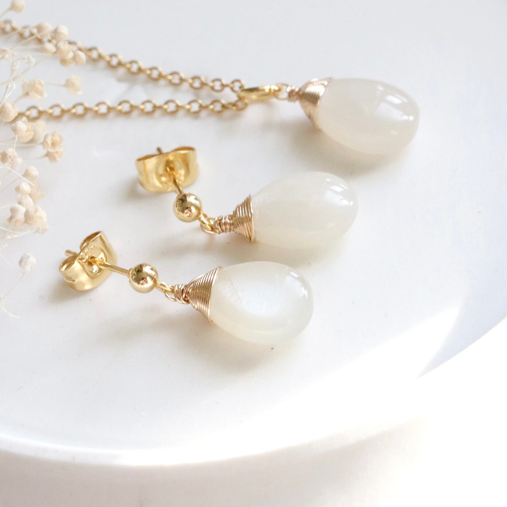 月光のホワイトムーンストーン ピアス&ネックレスセット|天然石|サージカルステンレス —Moonl