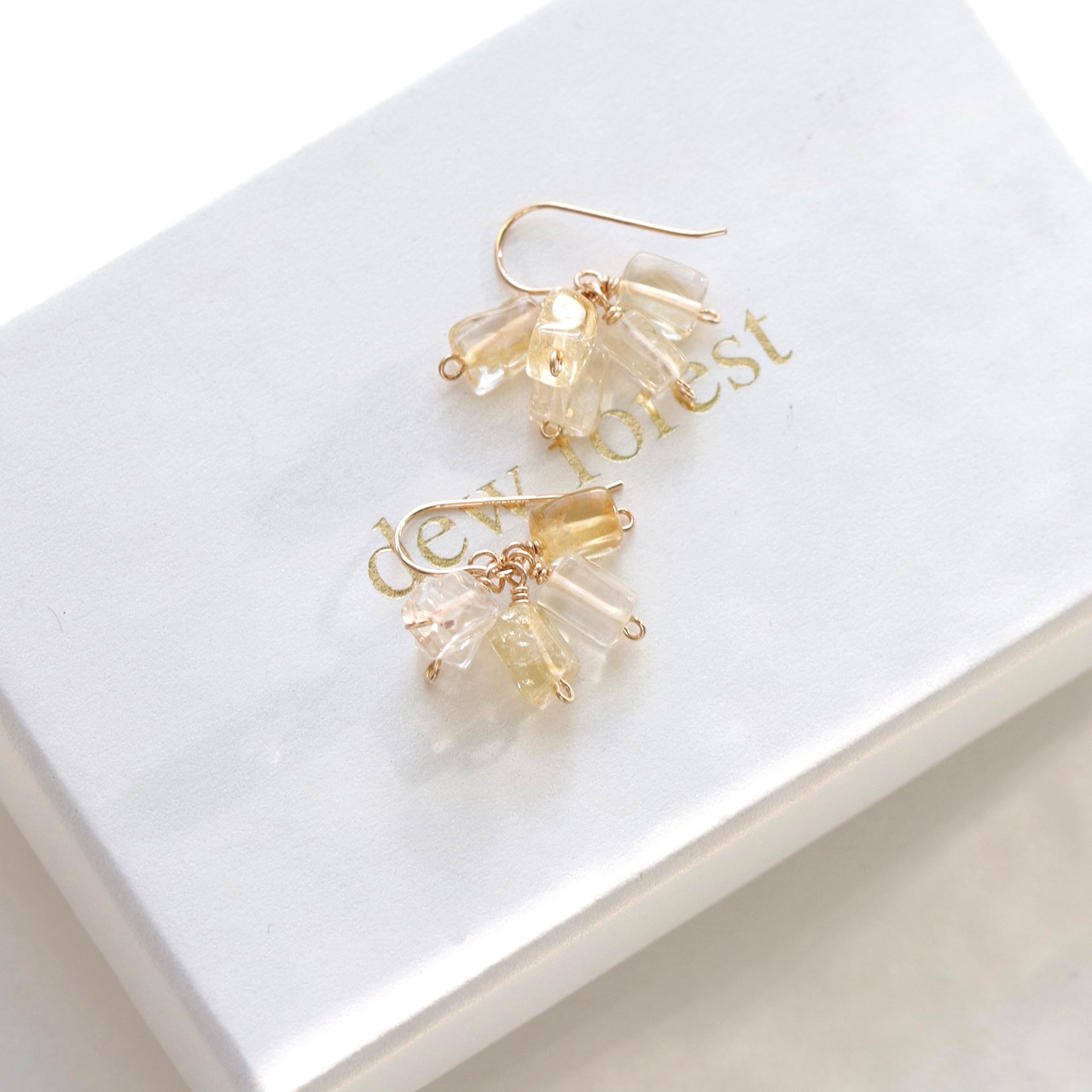 無色に近いシトリンと、薄いイエロー〜ゴールドカラーのシトリンの2色を使いました。キューブ形状の粒を5粒づつ、光が弾けたような明るい印象です。