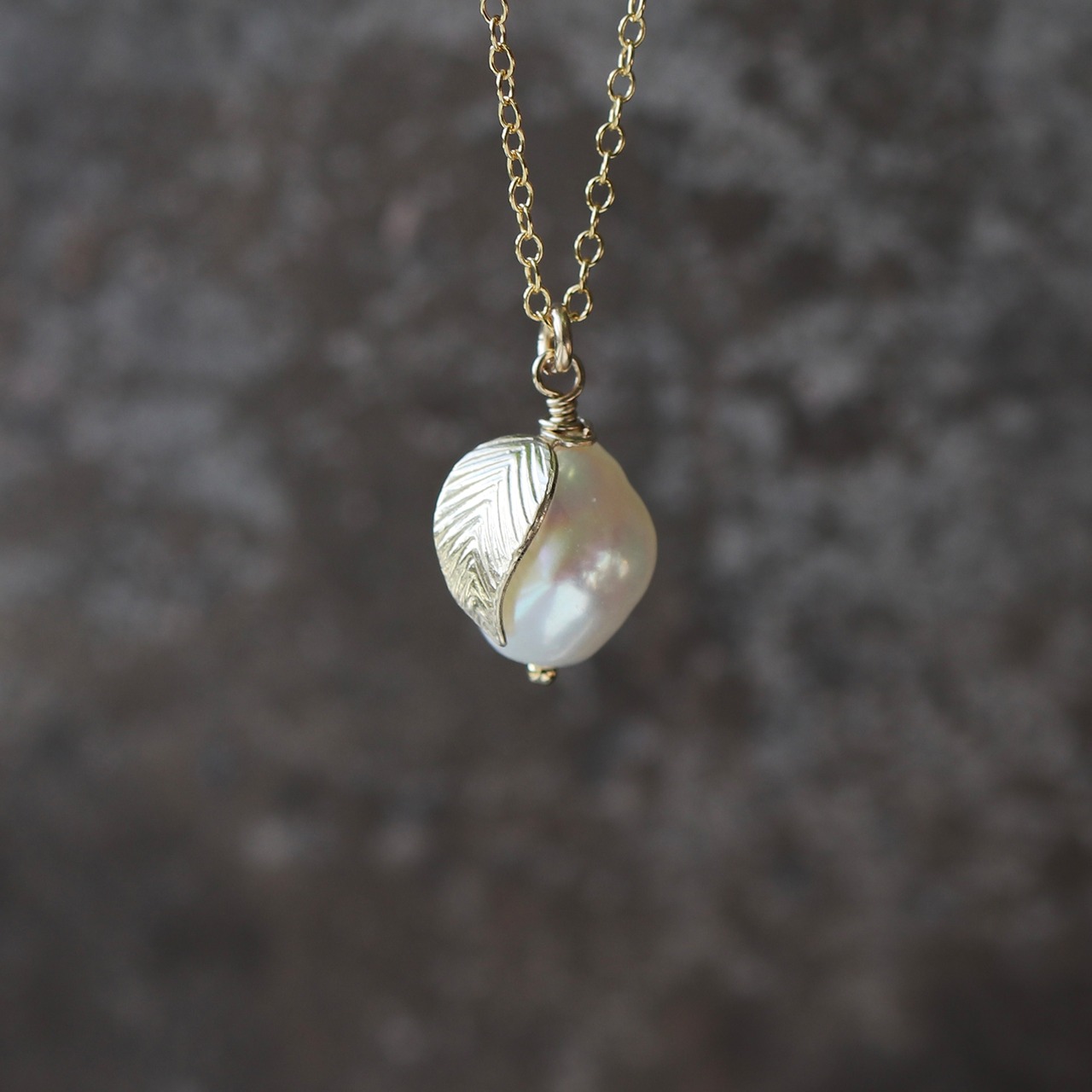 小さな淡水真珠と葉っぱで作った小さな“パール林檎”