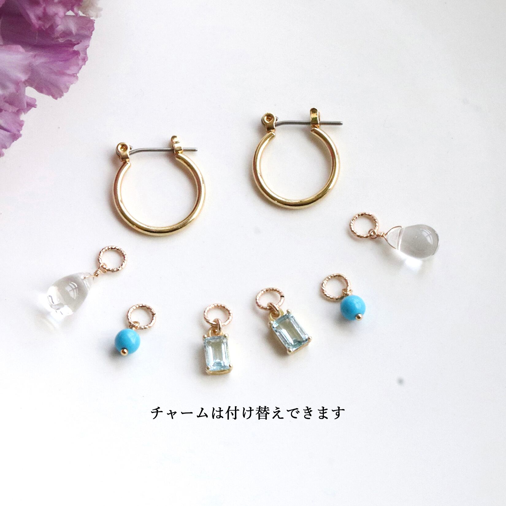 3種類の天然石チャーム付きフープピアスです。