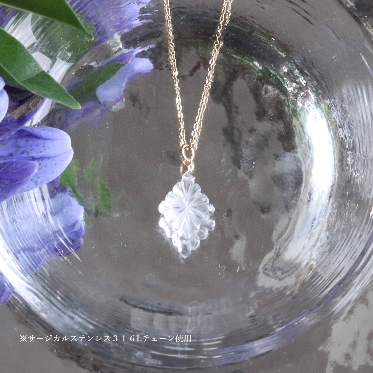菱形にカットした無色透明なクリスタルクォーツに、中心から放射状に裏と表の両面に彫刻が施されています。上品で爽やかなネックレスです。
